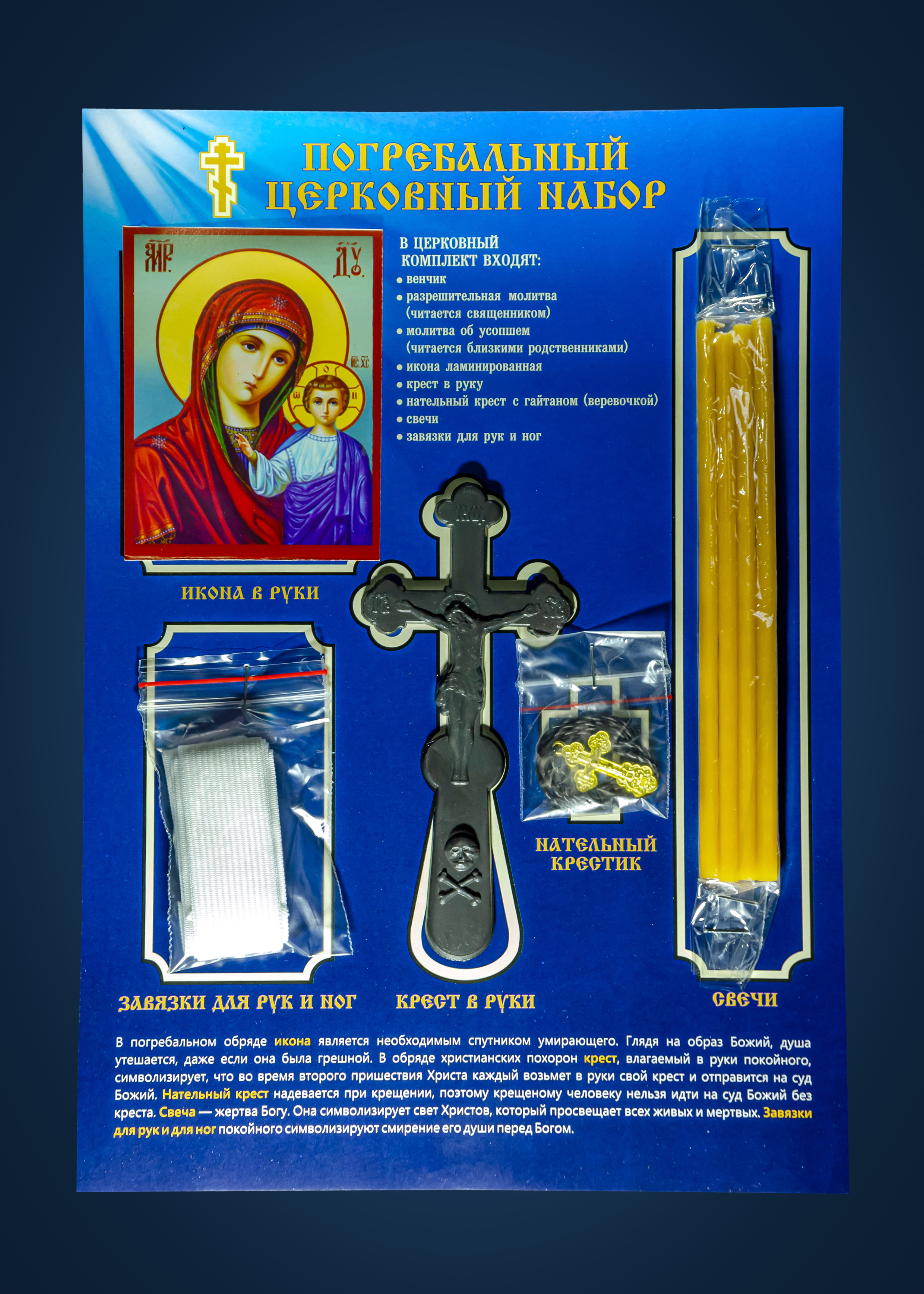 комплектация: венчик, разрешительная молитва,молитва об усопшем,икона ламинированная, крест в руку, крест нательный, свечи 4шт, комплект завязок для рук и ног